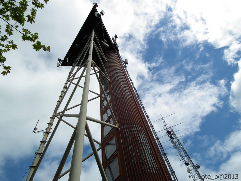 Točité železné schodiště vede tubusem prosvětleným řadou oken. Uvnitř tubusu je 144 schodů a venku je ještě 22 schodů betonových. Nahoře je umístěna trojboká vyhlídková plošina. Voda na několika místech plošiny svědčí o včerejším vytrvalém dešti. Škoda že nejdou otvírat okna, fotit tedy musím přes sklo. Je nečekaně dobrá viditelnost, můžeme tak vidět německé pohoří Hoher Bogen, část Šumavy i Český les s nejvyšším vrcholem Čerchov.