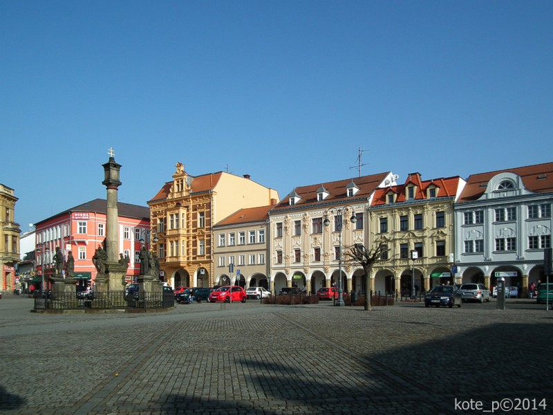 Náměstí vévodí jezdecká socha krále Jiřího. My ale nejdřív zamíříme pro turistickou známku. Infocentrum je však zavřené, ještě totiž nezačala turistická sezóna :-(. Než zjistíme náhradní prodejní místo, aspoň se můžu trochu porozhlédnout. Náměstí je podlouhlého, lehce nepravidelného tvaru. Panuje tu čilý dopravní a turistický ruch, skoro až chaos. Ale i tak, musím přiznat, že náměstí svoje kouzlo rozhodně má.