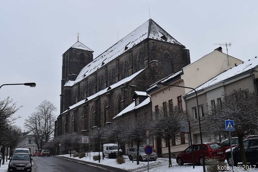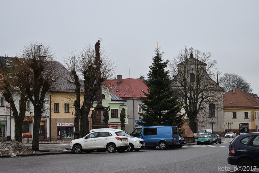 Zaparkujeme, nakoupíme a cestou zpátky k autu fotím ozdobený vánoční stromek na náměstí a taky nedaleký Mariánský kostel.