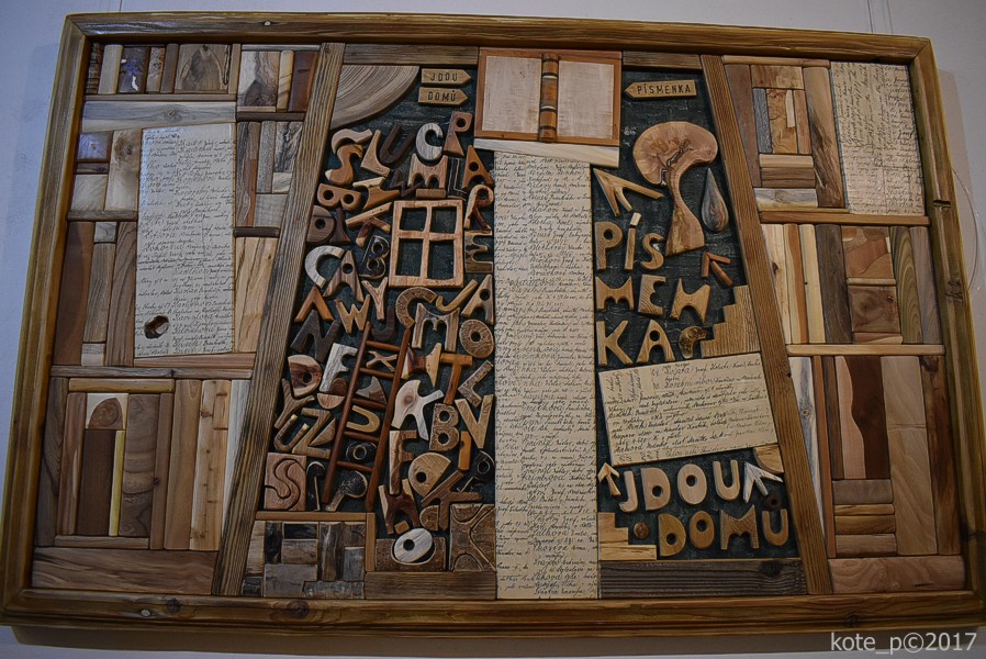 Jsou tu betlémy papírové i dřevěné, některé malé, jiné obsahují desítky figurek. Nejvíc se mi líbí Český betlém s kostelíčkem a chaloupkami zachumlanými pod sněhem. Na stěnách jsou umístěny dřevěné obrazy, které tu vystavuje výtvarník Martin Patřičný. Jeho koláže obsahují kousky dřeva z různých stromů a jsou zajímavé nejen nápadem, ale i barvou, vůní a dokonalým opracováním povrchu. Nezapomenutelná je Knihovna a v těsném závěsu pak Písmenka a Strom.