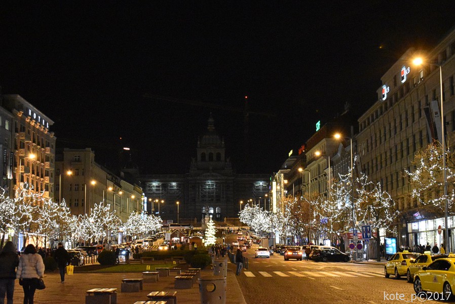 Václavák je celý rozzářený, stromy po obou částech jsou osvětlené jako v Boleslavi. V horní části náměstí je ozdobený vánoční strom ještě jeden, ne umělý, ale živý. Projdeme až nahoru ke svatému Václavovi; jezdec na koni oproti tmavému pozadí opravované budovy Národního muzea doslova září. Druhou stranou náměstí zamíříme zpátky dolů, na metro. Cestou k autu si pochvalujeme parádní vánoční procházku. Naměřeno něco přes 11 tisíc kroků.