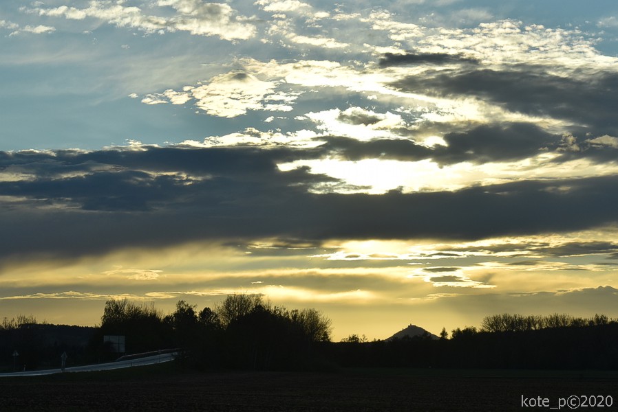 Už cestou pozoruju zlatě nasvícené mraky, které slibují nádherný západ slunce. Pojedeme na Mužský, odtamtud bude dobrý rozhled. Kupovité bílé mraky se seskupují do fantastických tvarů, v jednom místě se dokonce vytvořil kousek duhy.